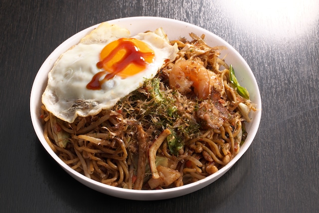 キャベツやもやし、豚肉、海鮮など具材をふんだんに使った焼きソバも人気の品。 ほぐし水の代わりに、和風出汁と鶏がらスープを入れて蒸し焼きにすることで、通常の中太麺をさらに美味しく仕上げています。 味付けには、関西のどろソースなど4種類をブレンドしたソースを使用。 麺にしっかりと絡まり、濃厚な味わいとなっています。