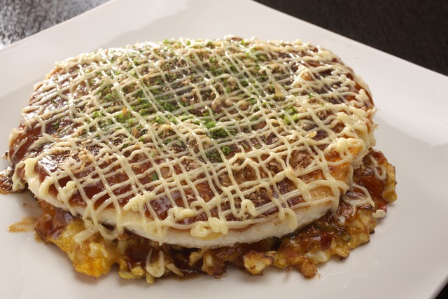 お好み焼き(エビ・イカ・ブタ)の上に、ふわふわに焼いた大和芋と玉子を重ね2層仕立てにした当店の看板メニュー。 すりおろした大和芋のふわふわ食感とお好み焼きが口の中で重なり、今までにない味わいを感じていただけると思います。